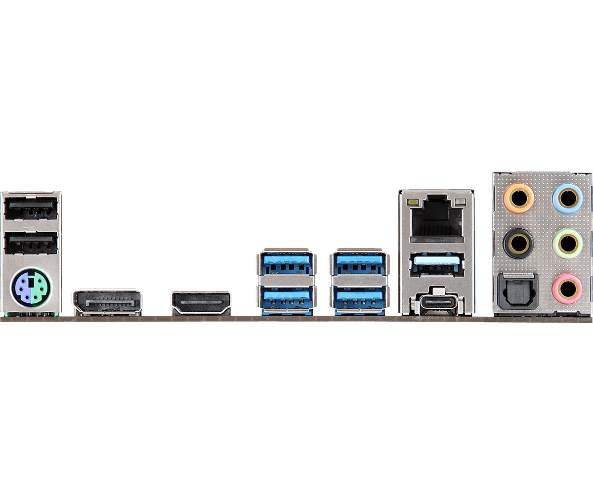 | Rear Panel I/O | – 1 x PS/2 Mouse/Keyboard Port – 1 x HDMI Port – 1 x DisplayPort 1.2 – 1 x Optical SPDIF Out Port – 2 x USB 2.0 Ports (Supports ESD Protection) – 1 x USB 3.2 Gen2 Type-A Port (10 Gb/s) (Supports ESD Protection) – 1 x USB 3.2 Gen2 Type-C Port (10 Gb/s) (Supports ESD Protection) – 4 x USB 3.2 Gen1 Ports (Supports ESD Protection) – 1 x RJ-45 LAN Port with LED (ACT/LINK LED and SPEED LED) – HD Audio Jacks: Rear Speaker / Central / Bass / Line in / Front Speaker / Microphone (Gold Audio Jacks) |