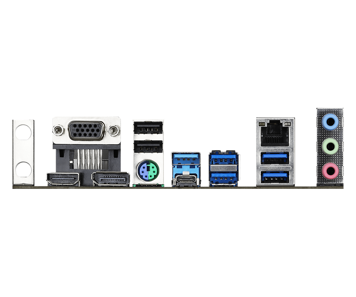 | Rear Panel I/O | – Antenna Bracket – 1 x PS/2 Mouse/Keyboard Port – 1 x D-Sub Port – 1 x HDMI Port – 1 x DisplayPort 1.4 – 1 x USB 3.2 Gen2 Type-A Port (10 Gb/s) (Supports ESD Protection) – 1 x USB 3.2 Gen2 Type-C Port (10 Gb/s) (Supports ESD Protection) – 4 x USB 3.2 Gen1 Ports (ASMedia ASM1074 hub) (Supports ESD Protection) – 2 x USB 2.0 Ports (Supports ESD Protection) – 1 x RJ-45 LAN Port with LED (ACT/LINK LED and SPEED LED) – HD Audio Jacks: Line in / Front Speaker / Microphone |