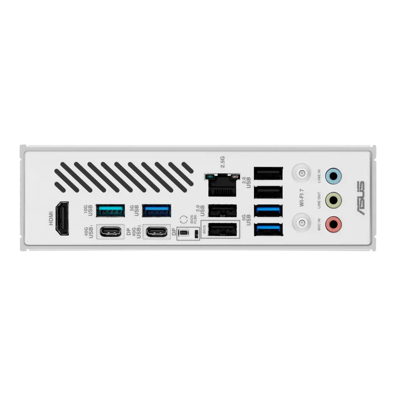 Back Panel I/O Ports | 2 x USB4® (40Gbps) ports (2 x USB Type-C®) 1 x USB 10Gbps port (1 x Type-A) 3 x USB 5Gbps ports (3 x Type-A) 4 x USB 2.0 ports (4 x Type-A) 1 x HDMI™ port 1 x Wi-Fi module 1 x Realtek 2.5Gb Ethernet port 3 x Audio jacks 1 x BIOS FlashBack™ button |