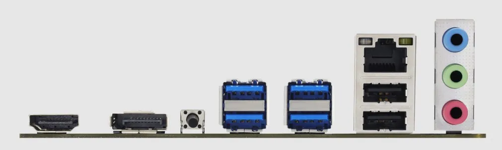 | REAR I/O | 1 x BIOS UPDATE Button 1 x HDMI Port (HDMI1.4) 1 x DP Port (DP1.2) 4 x USB 3.2 (Gen1) Type-A Ports 2 x USB 2.0 Type-A Ports 1 x Giga LAN port 3 x Audio Jack |
