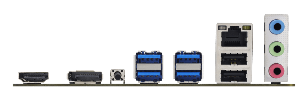 REAR I/O | 1 x BIOS UPDATE Button 1 x HDMI Port (HDMI1.4) 1 x DP Port (DP1.2) 4 x USB 3.2 (Gen1) Type-A Ports 2 x USB 2.0 Type-A Ports 1 x Giga LAN port 3 x Audio Jack |