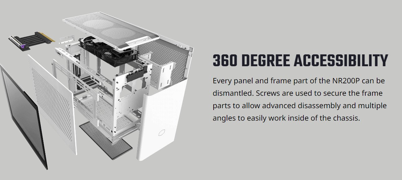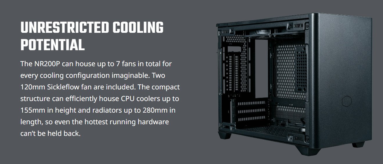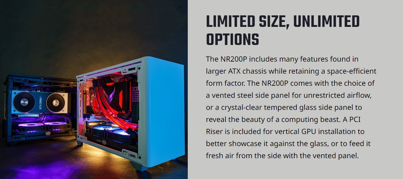 | What’s included? | 1x Cooler Master NR200P Casing 1x Mesh Side Panel 1x Glass Side Panel 2x SickleFlow 120mm Fans 1x PCIe 3.0 x16 riser cable (for vertical mount GPU) |