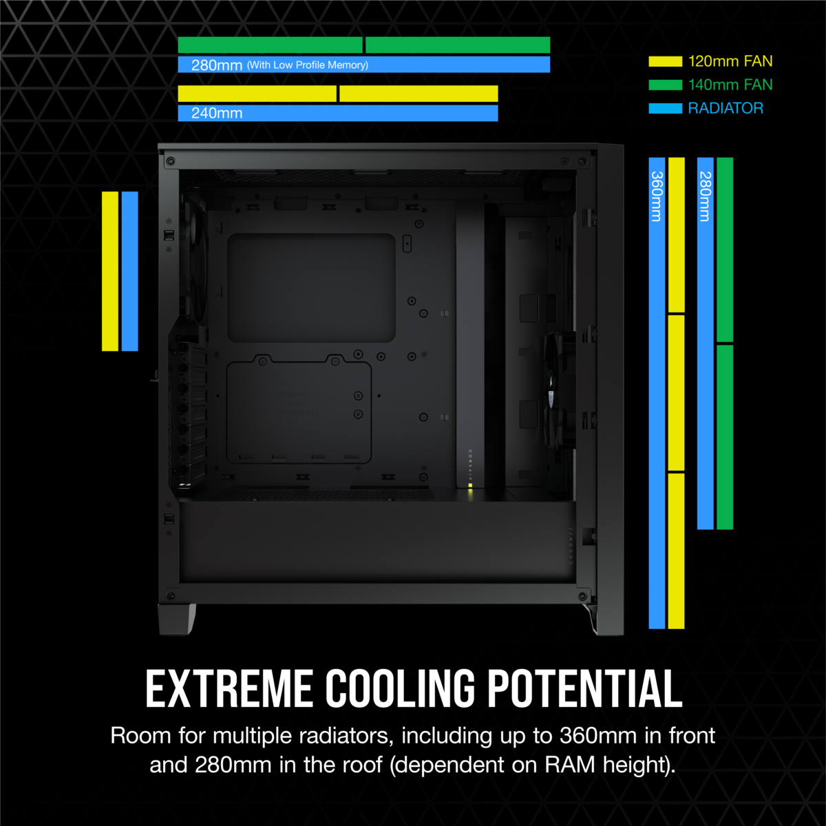| Radiator Support | Front: 280mm or 360mm Top: 240mm or 280mm (with low profile ram) Rear: 120mm |