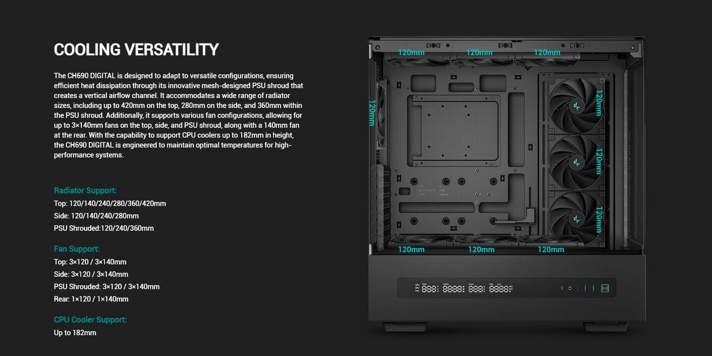 | Fan Support | Front:NA Top:3×120 / 3×140mm Side:3×120 / 3×140mm PSU Shrouded :3×120 / 3×140mm Rear: 1×120 / 1×140mm |