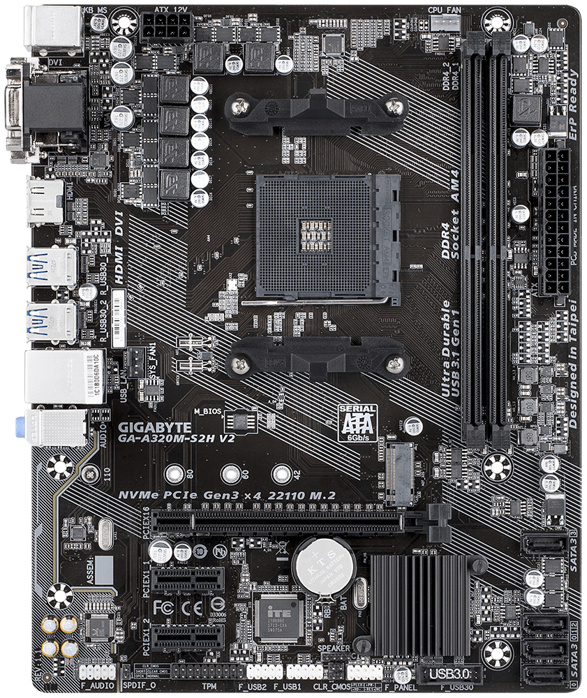 | Storage Interface | 1 x M.2 connector (Socket 3, M key, type 2242/2260/2280/22110 SATA and PCIe x4/x2* SSD support) * Actual support may vary by CPU. * Supports only M.2 SATA SSDs when using an AMD Athlon™-series/ 7th Gen. A-series or Athlon™ X4 APU.4 x SATA 6Gb/s connectors |