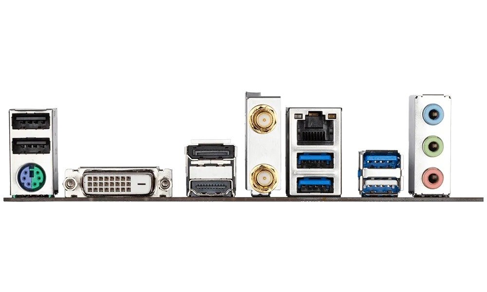 | Back Panel Connectors | 1 x PS/2 keyboard/mouse port 1 x DVI-D port 1 x DisplayPort 1 x HDMI port 2 x SMA antenna connectors (1T1R) 4 x USB 3.2 Gen 1 ports 2 x USB 2.0/1.1 ports 1 x RJ-45 port 3 x audio jacks |