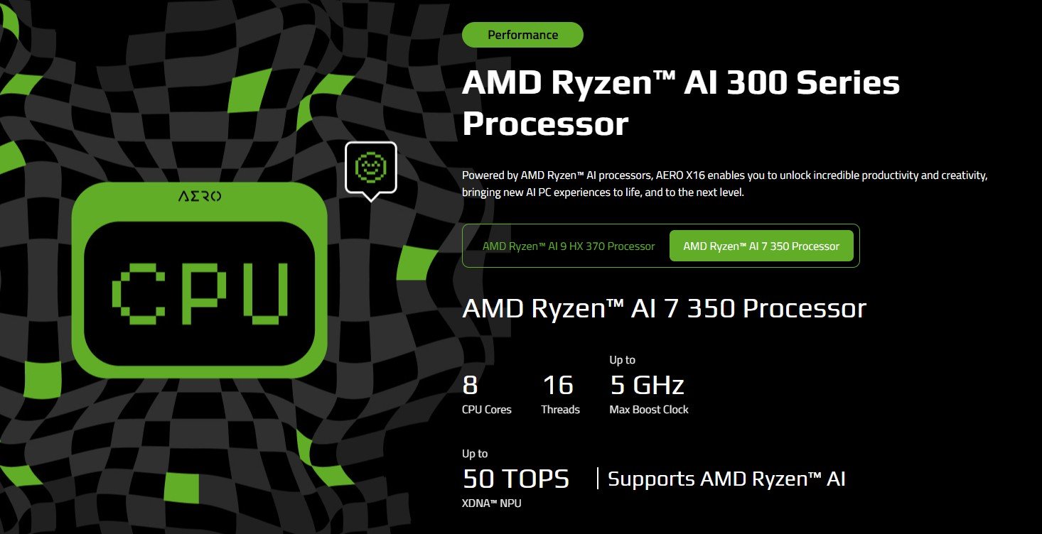 | CPU | AMD Ryzenâ„¢ Al 7 350 (16MB cache, up to 5 GHz, 8 cores, 16 threads) |
