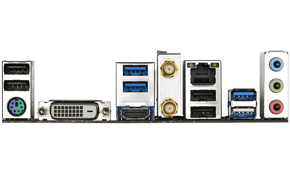 | Back Panel Connectors | 1 x PS/2 keyboard/mouse port 1 x DVI-D port 2 x SMA antenna connectors 1 x HDMI port 4 x USB 3.2 Gen 1 ports 4 x USB 2.0/1.1 ports 1 x RJ-45 port 3 x audio jacks |