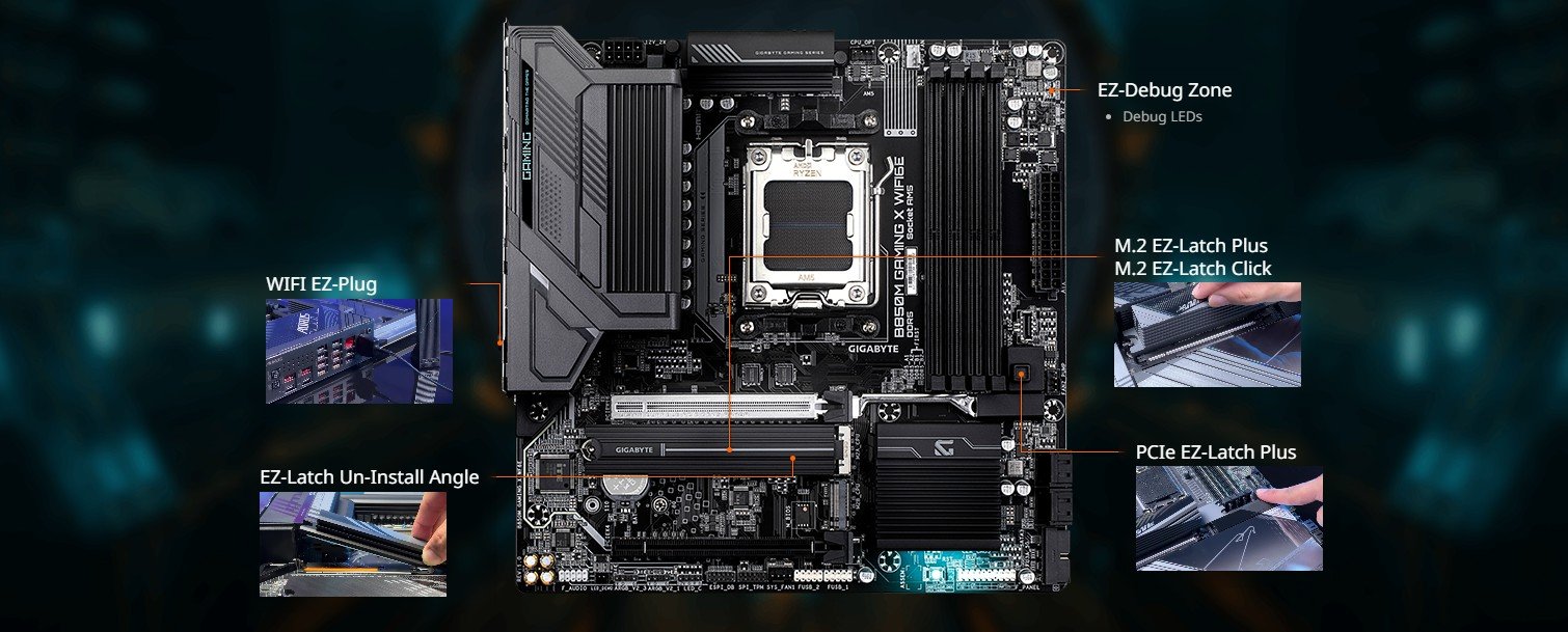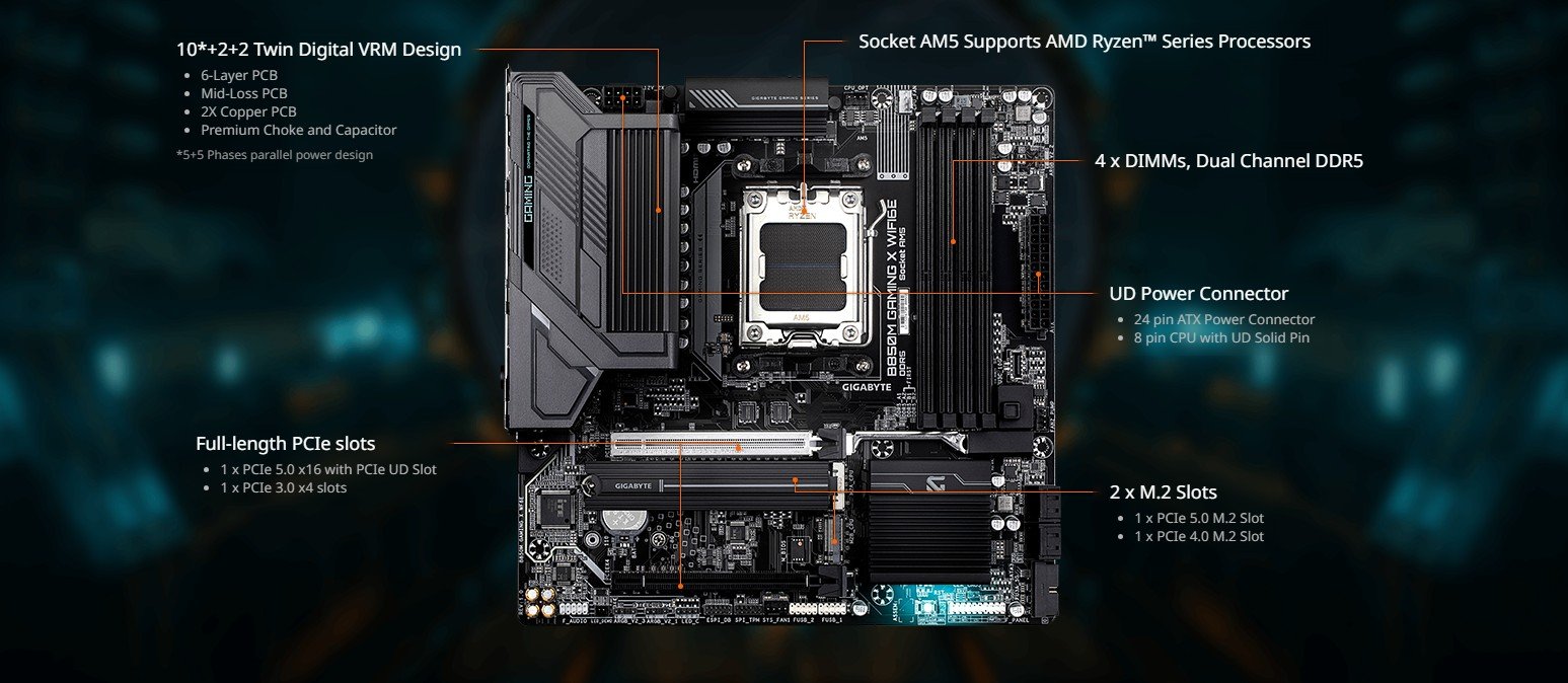 | CPU | AMD Socket AM5, support for: AMD Ryzen™ 9000 Series Processors/ AMD Ryzen™ 8000 Series Processors/ AMD Ryzen™ 7000 Series Processors |