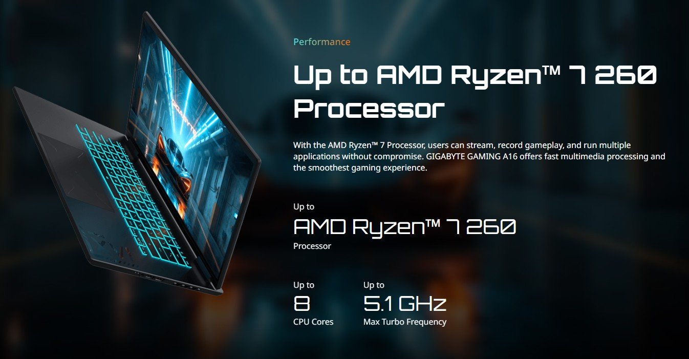 Gigabyte Gaming A16 | 16″ 165hz | Ryzen 7 260 | 16GBx1 DDR5 (2 slot) | 512GB NVMe | RTX 5050 8GB | (Model: 3THK3PH893SH) Gaming Laptop