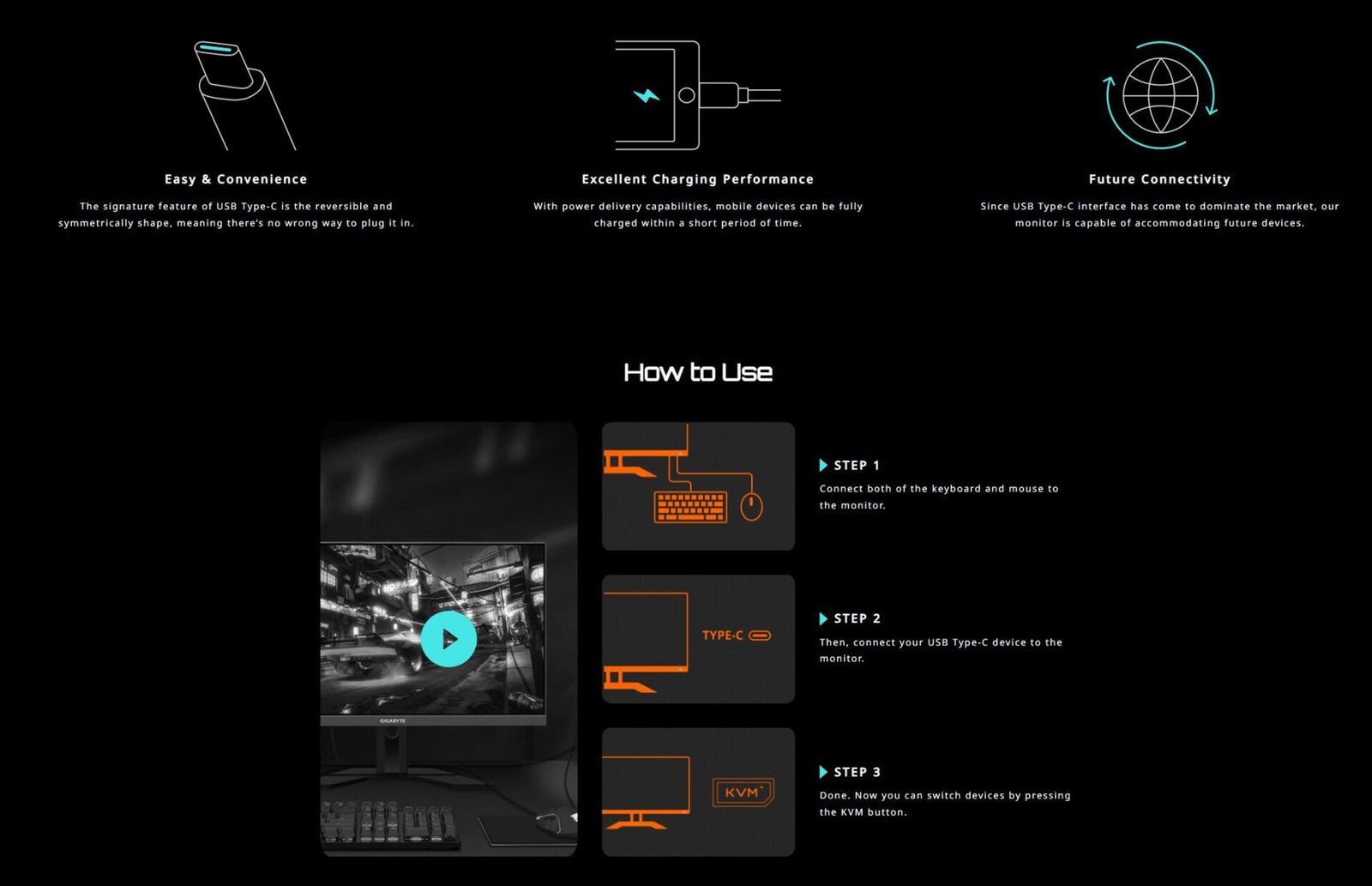 - Special Feature: KVM (Connect smartphone/tablet on monitor using Type C port, control device via USB mouse/keyboard connected to monitor)