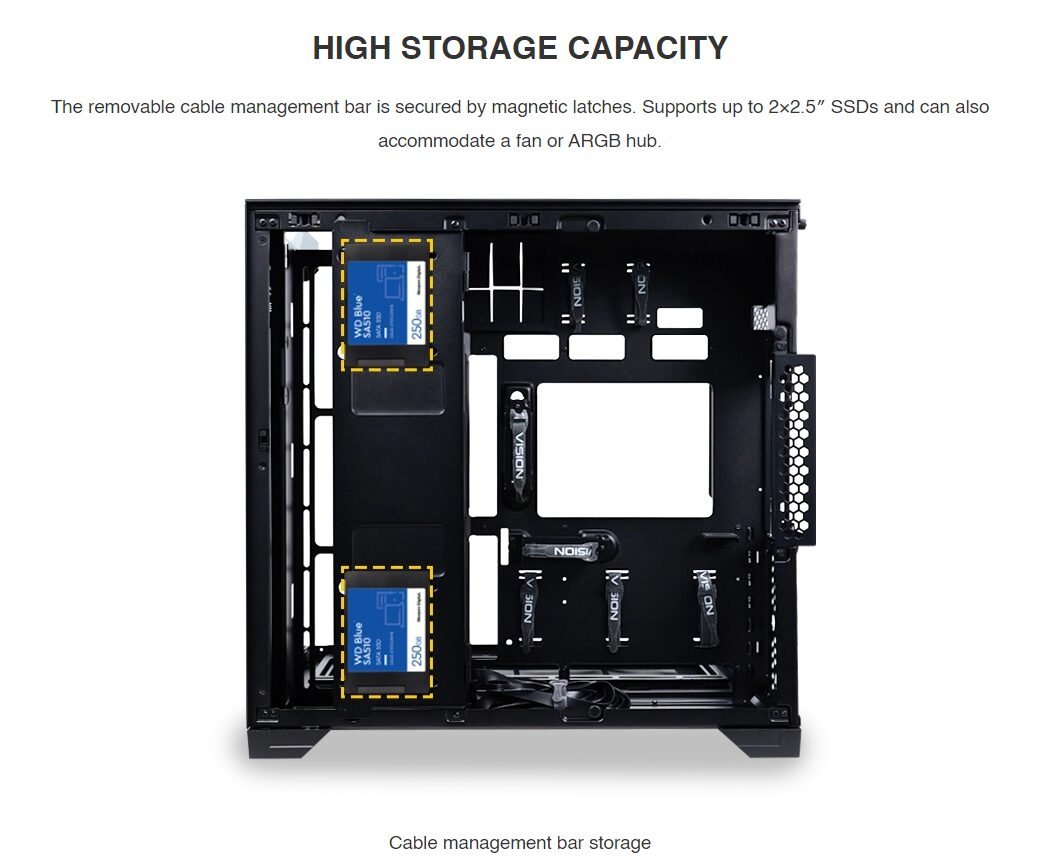 | STORAGE | Behind MB Tray: 2 x 2.5″ SSD Hard drive cage: 2 x 3.5″ HDD or 2.5″ SSD |
