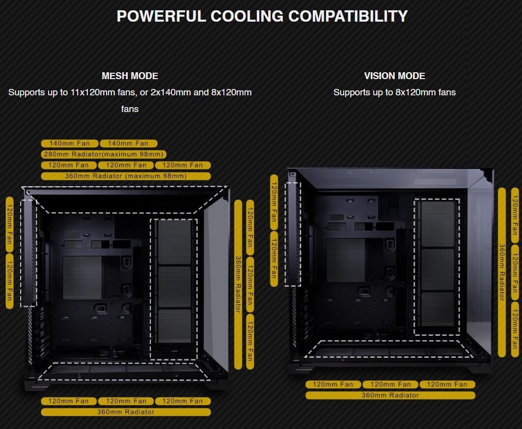 | FAN SUPPORT | Top: 120mm x 3 or 140mm x 2 Side: 120mm x 3 Bottom: 120mm x 3 Rear: 120mm x 2 |