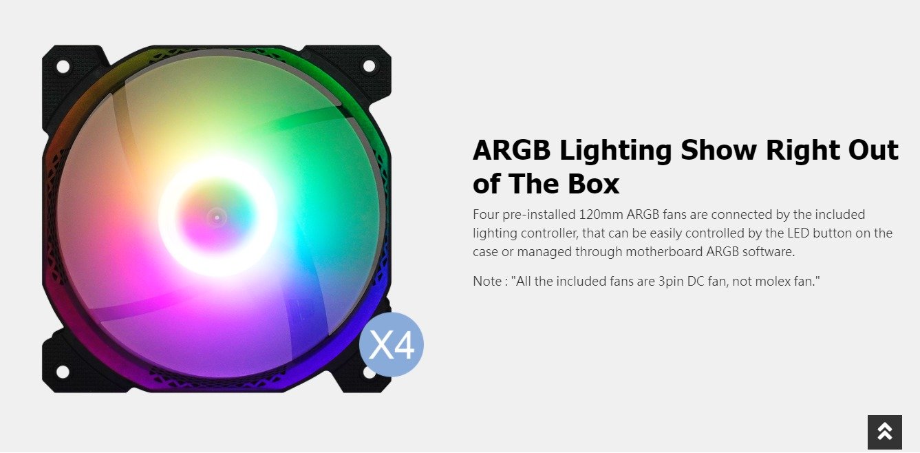 | Pre-Installed Fans | Front: 120mm*3 (ARGB Fan) Rear: 120mm*1 (ARGB Fan) |
