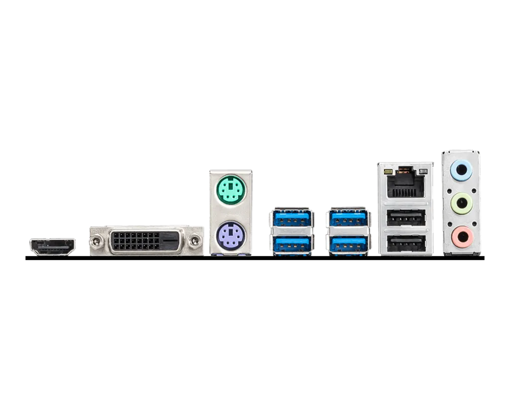 | Back Panel Connectors | LAN port HDMI™ DVI-D Keyboard / Mouse USB 3.2 Gen 1 5Gbps Type-A USB 3.2 Gen 1 5Gbps Type-A USB 2.0 Ports Audio Connectors |