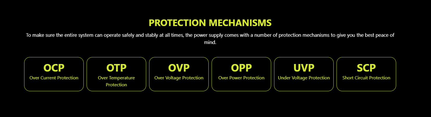 | Protection | OCP / OVP / OPP / OTP / SCP / UVP |