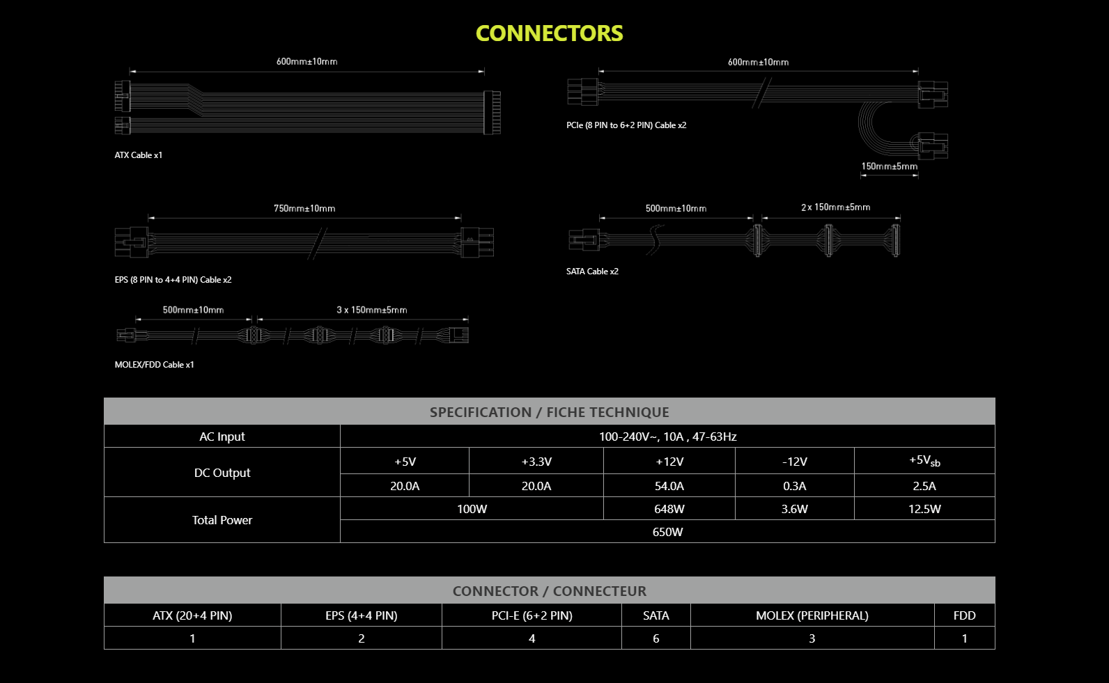 | Connectors | ATX (24 pin) x 1 EPS (4+4 pin) x 2 PCI-E (6+2 pin) x 4 SATA (15 pin) x 6 MOLEX (4 pin) x 3 FDD (4 pin) x 1 |