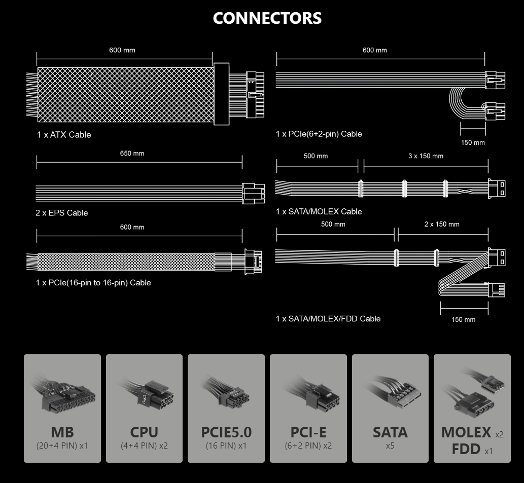 | Connectors | ATX (24 pin) x 1 EPS (4+4 pin) x 2 PCI-E (6+2 pin) x 2 (1 cable) SATA (15 pin) x 5 (2 cables) MOLEX (4PIN) x 2 (2 cables) FDD (4 pin) x 1 PCI-E 5.0 (16 pin) x 1 (1 cable) (up to 300w) |