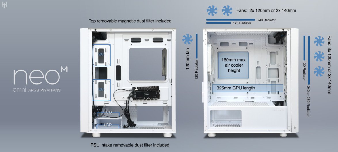 | Support and Clearance | 325mm max GPU length 160mm max CPU Cooler height 180mm max PSU length |
