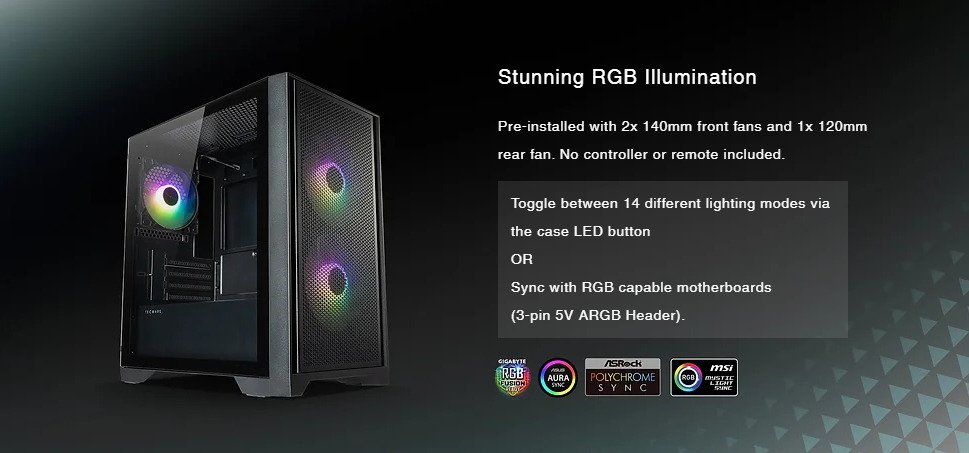 | FANS | Front: 2x 140mm (Included) or 2x 120mm (Optional) Rear: 1x 120mm (Included) Top: 2x 120mm / 140mm |