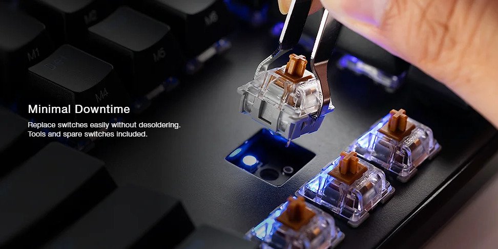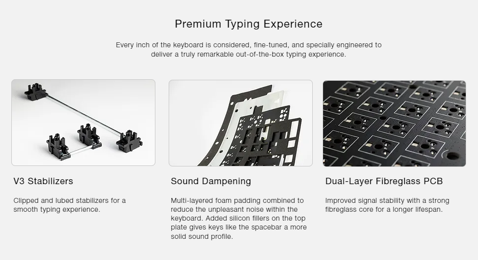 | Other Features | V3 Stabilizers (Clipped & Lubed) Sound Dampening Foam (PCB + Bottom) Silicone Spacebar Filler North-facing 3-pin Tecware Switch Sockets 16.8 million RGB Per-key Customization Replaceable Switches w/ Spare Switches & Tools Included Double-walled ABS Keycaps Side-printed Multimedia Keys |