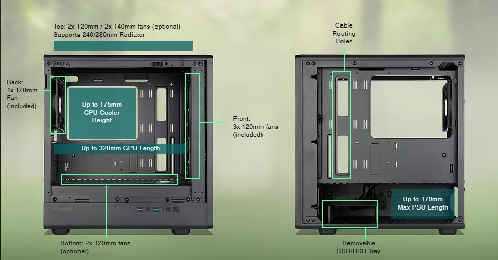 | SUPPORT AND CLEARANCE | 320mm Max GPU Length 175mm Max CPU Cooler Height 170mm Max PSU Length mATX, ITX |