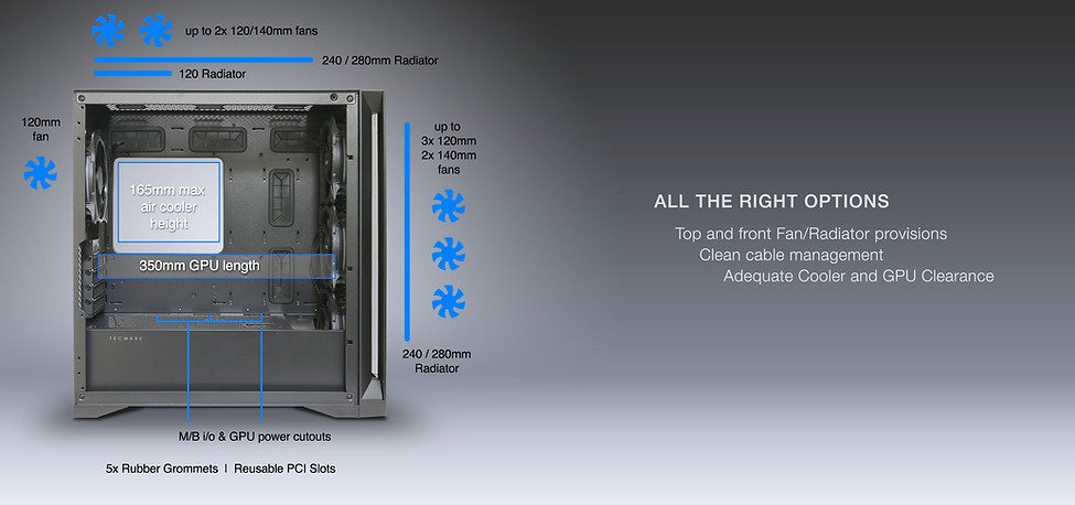 Rear 120mm Radiator support Top 240/280mm Radiator support 350mm Max GPU Card 165mm Max CPU Cooler 200mm Max PSU length Cable Management ITX, mATX motherboard |